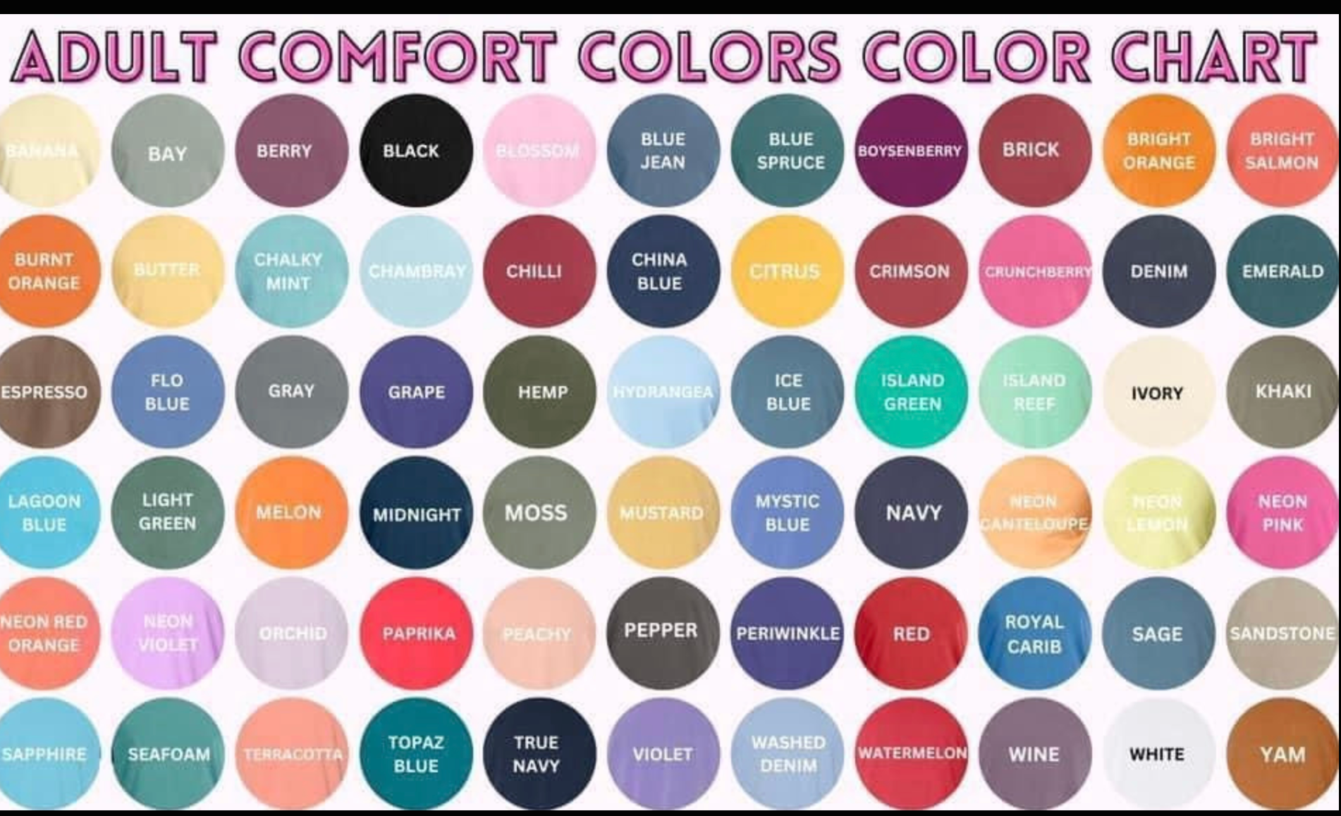 See color chart below! Please make sure you are using the correct color chart for youth and adults.